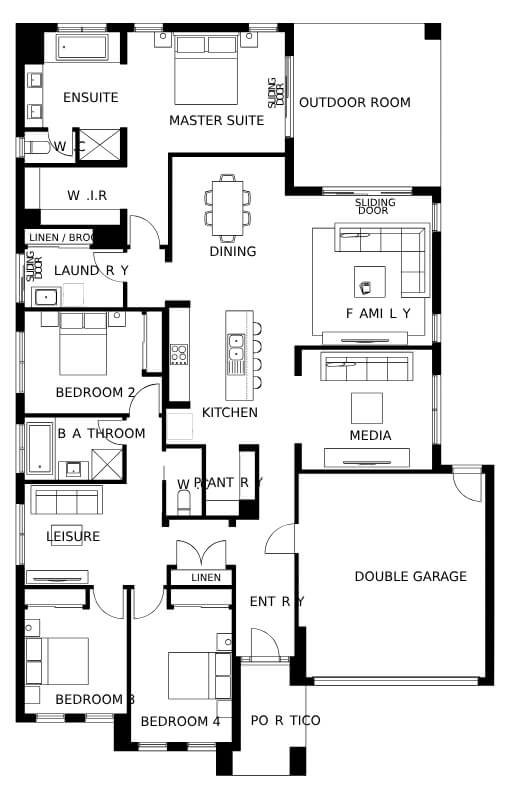 You won’t know yourself in this large and elegant home. Designed to meet the requirements of a large family, this single-storey home will equally delight and surprise you. Featuring four bedrooms, including a large private master suite tucked away at the back, this home also has plenty of spaces for the family to get together to discuss their day. A central kitchen with pantry looks into the living and dining rooms, as well as the rumpus room, study and outdoor room. The large double garage and leisure room are bonuses for an already exciting home design.